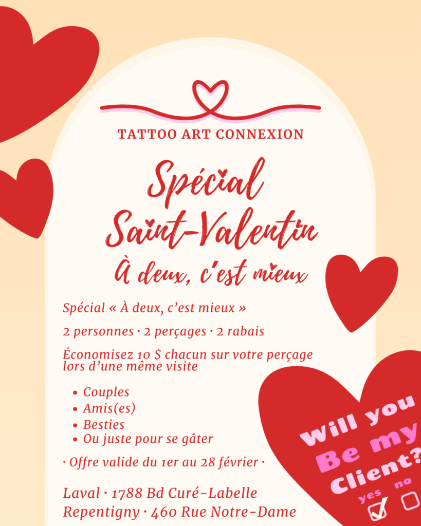 Pour tout le mois de février, à l’occasion de la Saint-Valentin, profitez de notre promotion spéciale « À deux, c’est mieux » : venez à deux pour un perçage lors d’une même visite et économisez 10 $ chacun.